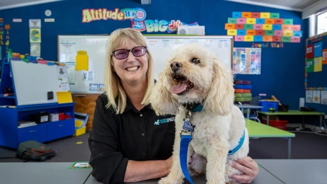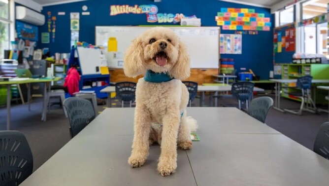 Starting school can be rough, but 11-year-old spoodle Ted can help nervous students focus on the paw-sitive.