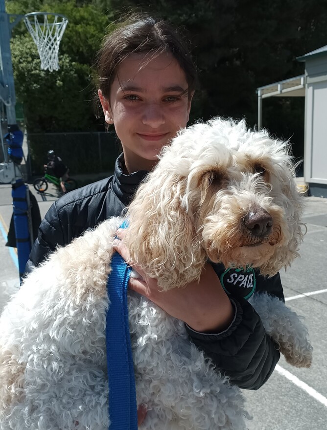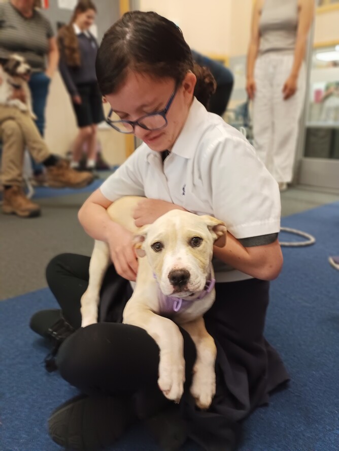 One of the gorgeous rescue pups from HUHA enjoying some cuddles with our awesome Aotea College students.